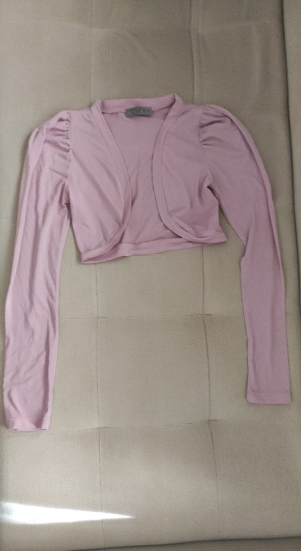 Pastel pembe, uzun kollu, vücuda oturan ve drapeli bolero. Yuvarlak yakalı, yumuşak sentetik kumaştan, sokak stili için uygun. M beden, genç kızlara uygun