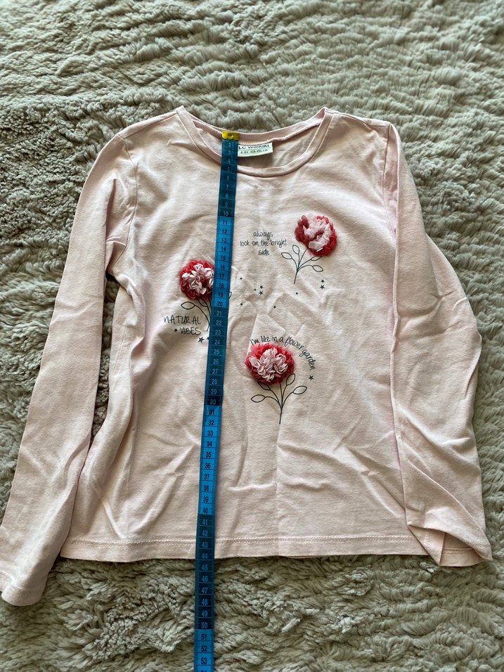 Pembe renkli, uzun kollu, düğmeli, çiçek baskılı kız tişörtü. Rahat bir görünüm için bol kesim ve yumuşak örme kumaştan yapılmıştır.