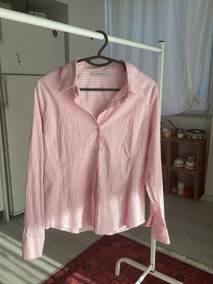 Pastel pembe gömlek, yakalı ve düğmeli ön detaylıdır. Uzun kollu ve normal kesim olup, desen içermez. Ofis için trend casual tarzına uygundur.