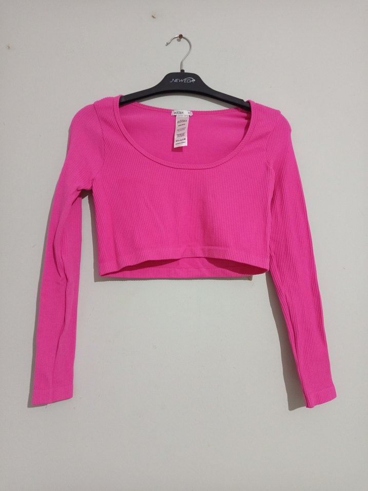 Pembe, uzun kollu, yuvarlak yakalı ve vücuda oturan crop top, yumuşak sentetik kumaştan. Minimalist, renkli ve rahat sokak stili için uygun. full esnektir xs-s uyumlu defo leke sökük yok temizdir- üstte duruş katolog resmi eklidir-