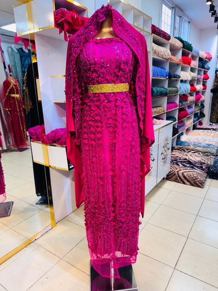 Pembe uzun kollu, drape detaylı, renkli desenli ve tekne yakalı kadın abiye. Düz kesim ve gösterişli tasarım, düğünler için uygun. ✨şalı ve balon kolu mevcuttur