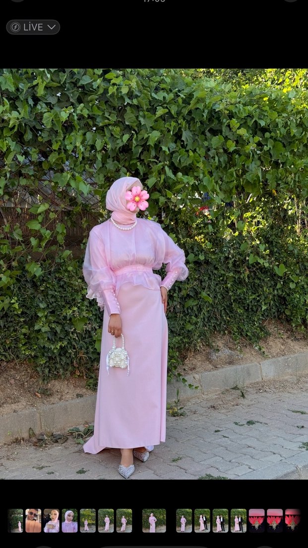 Pastel pembe uzun elbise, yüksek yakalı ve uzun kollu drape detaylıdır. Bağlama desenli, düzenli kesimle tesettür şıklığı sunar. Bir kere kardeşimin düğününde giydim. Detay isteyene fotoğraf atılır. Şal hediyeli.