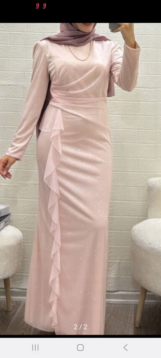 Pembe uzun kollu, drapeli ve vücuda oturan bu abiye elbise, düğünler için çağdaş ve zarif bir stil sunar. Sıfır sadece denemek için giyildi.