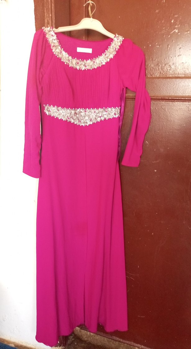 Pembe, parlak renkli, uzun kollu, tek parça abiye elbise. İpek gibi kumaştan, tekdüze ve drapeli tasarıma sahip, klasik ve vintage stilinde..