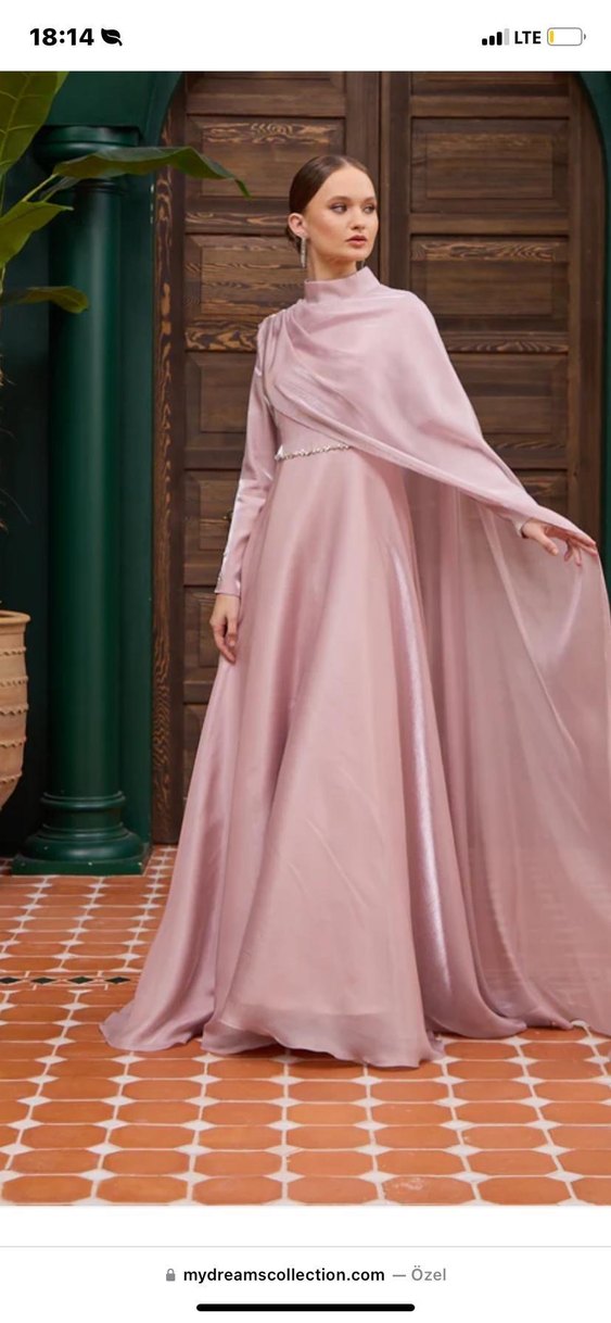Bu uzun pembe abiye elbise, yüksek yakalı ve uzun kollu olup, drapeli tasarımı ve parlak kumaşıyla klasik ve çağdaş bir şıklık sunar. Düğünler için idealdir bir kere giyildi “Mydreams collection” orijinal ürünü şalı ve iç bonesi mevcuttur 54 kiloyla giyildi tam kalıp herhangi bir hatası yoktur