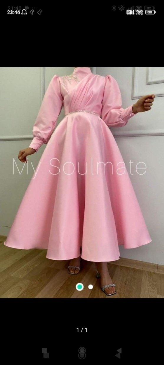 Pembe tonlarda, drapeli ve uzun kollu, tek renk uzun abiye elbise. Salaş kesimi ve tekne yaka detayıyla klasik ve çağdaş şıklık sunar.