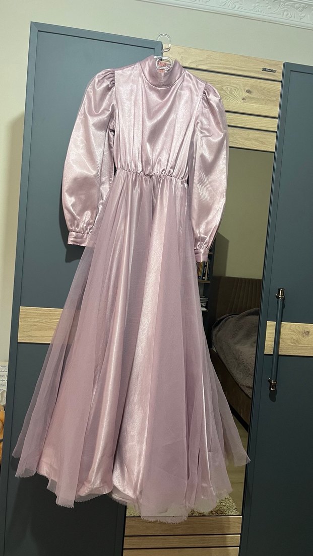 Pembe pastel tonlarda, uzun kollu ve yüksek yakalı, drapeli tasarıma sahip, bol kesim modern klasik stil abiye elbise. Defosunu ekledim