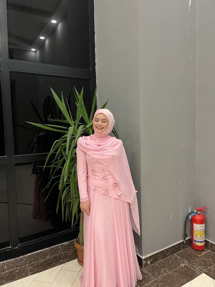 Pembe Uzun Kollu Drapeli Abiye Elbise