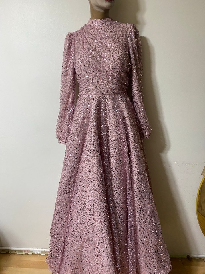 Pembe, uzun kollu ve yüksek yakalı bu uzun abiye elbise drapeli detaylara sahiptir. Gevşek kesimi ve parlak kumaşıyla düğünler için şık ve modern bir görünüm sunar.