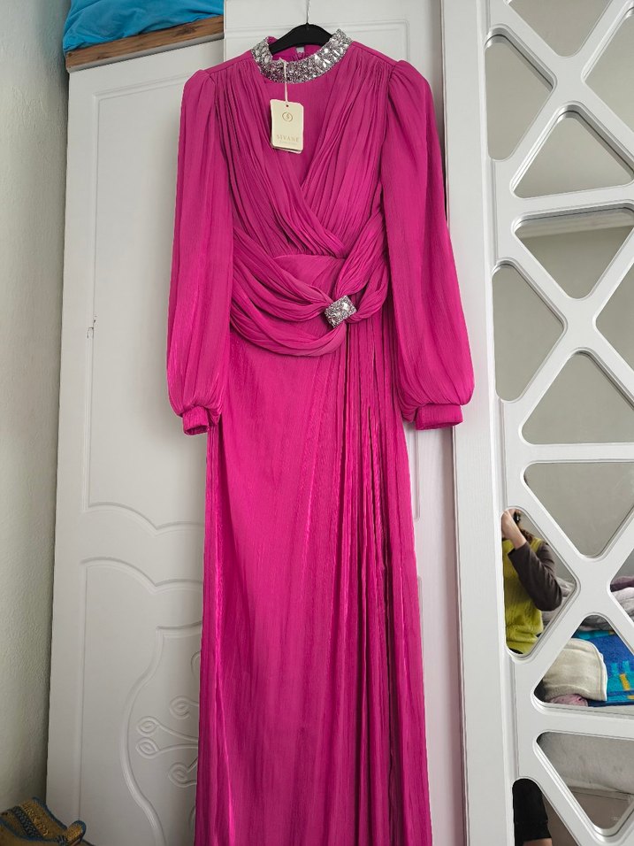 Pembe renkli, uzun kollu ve drapeli detaylara sahip uzun abiye elbise. Yüksek yakası parlak süslemelidir, bol kesim ve modern klasik tarzda, düğünler için uygundur. 38 beden etiket fiyatı yazıyor