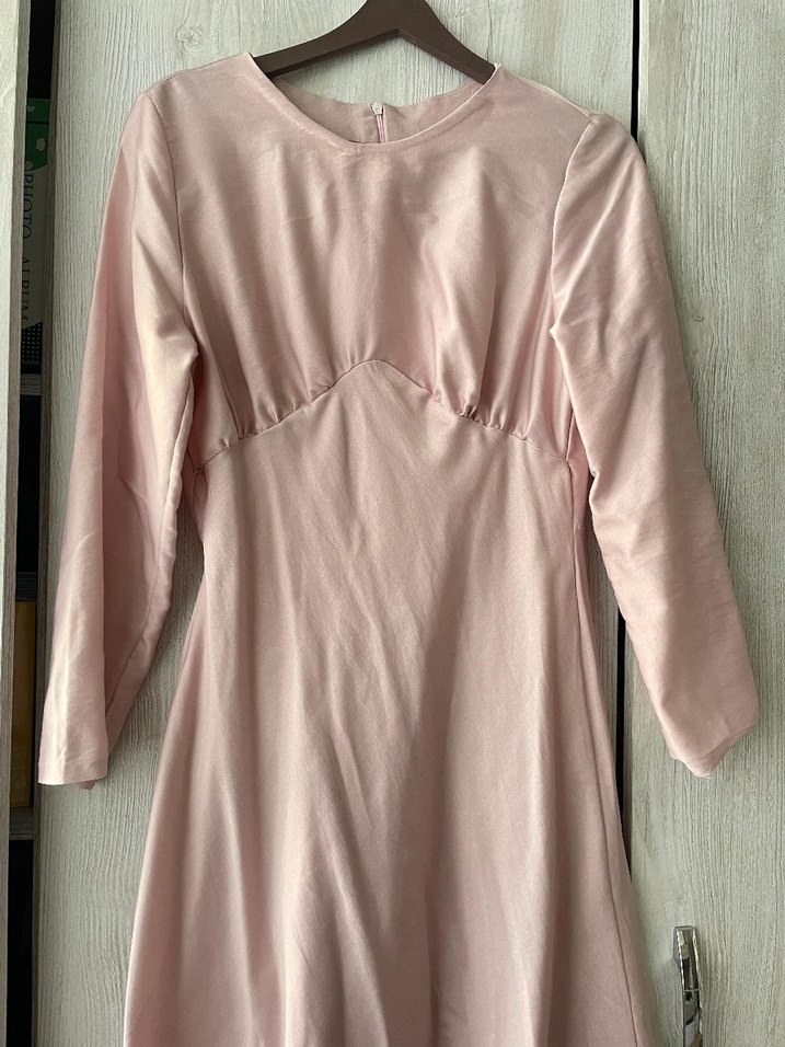 Pembe pastel renkte, uzun kollu ve drapeli detaylı, satenimsi kumaştan yapılmış, klasik ve desen içermeyen, vücuda oturan midi elbisedir. Ürün hazır değildir özel dikildi