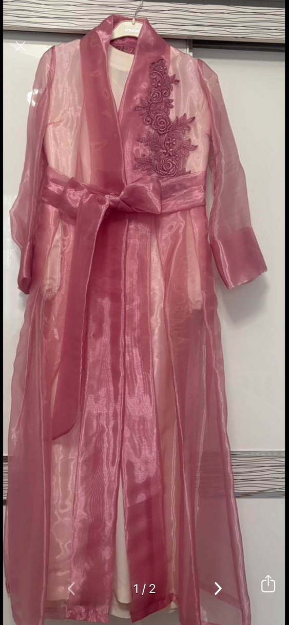 Uzun pembe abiye, drapeli ve bol kesimdir. Parlak kumaş, V yakalı, uzun kollu ve kuşaklıdır. Düğünler için bohem Paris tarzında uygundur.
