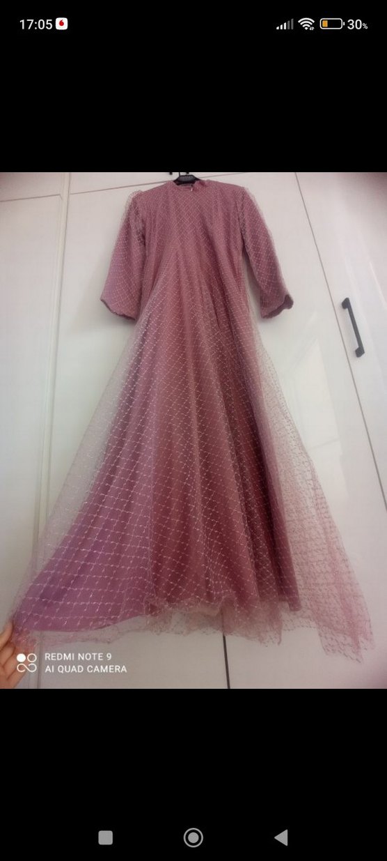 Uzun kollu, bol kesim pembe drapeli kadın abiye. V yaka ve vintage tarzıyla düğünler için uygun.