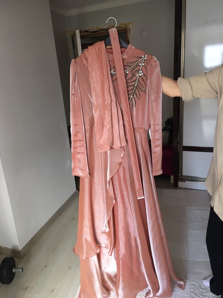 Parlak pembe renkte, yakalı ve uzun kollu, drapeli tasarıma sahip, düzenli kesim uzun abiye elbise. Düğünler için uygun. ✨ Şalı ile birlikte