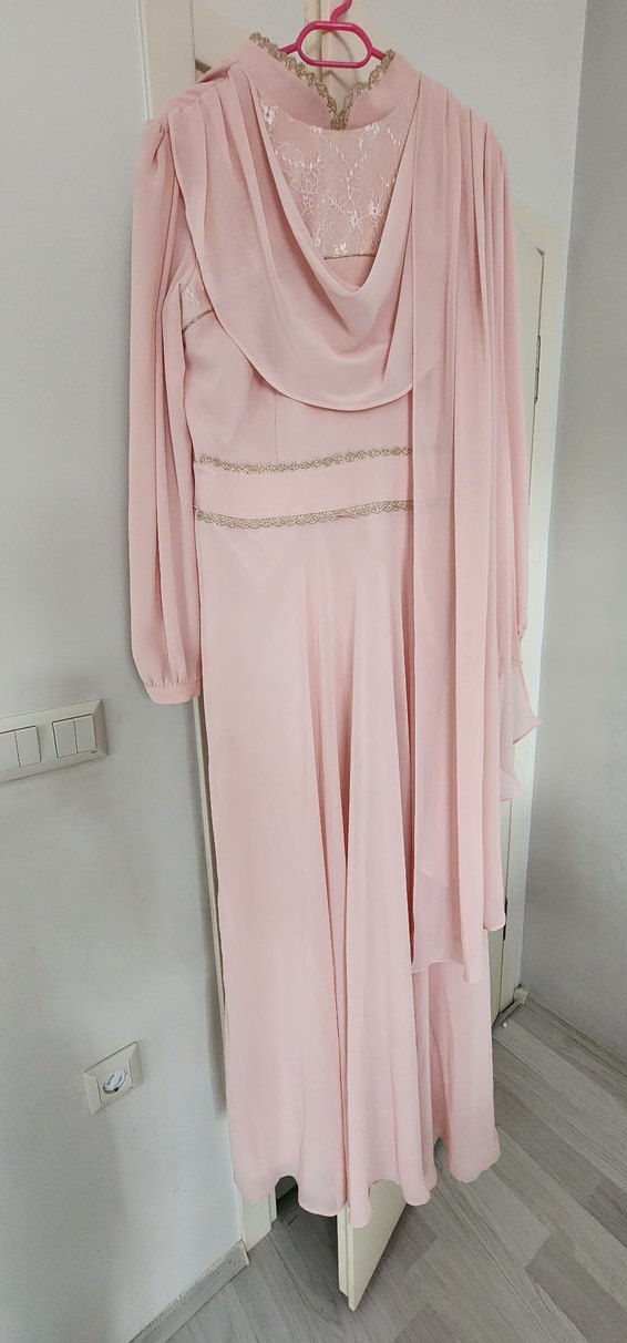 Pembe, uzun kollu ve yüksek yakalı, özel günler için kadın elbisesi. Drapeli detaylar ve ince bel süslemeleriyle vintage ve modern klasik tarzı yansıtıyor. Düğün için uygun.