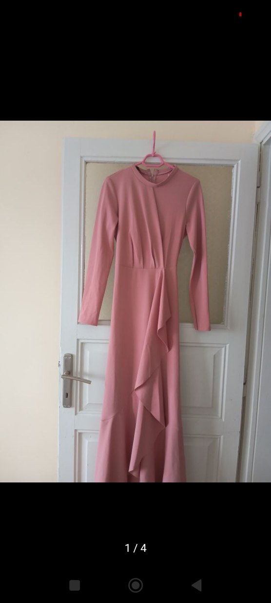 Yüksek yakalı ve uzun kollu, pembe uzun elbise. Drapeli tasarımı ve yumuşak sentetik kumaşıyla şık ve rahat bir duruş sağlar. sorunsuz temiz bi kac kez kullanıldı iki koltuk arası 42 bel 33 cm