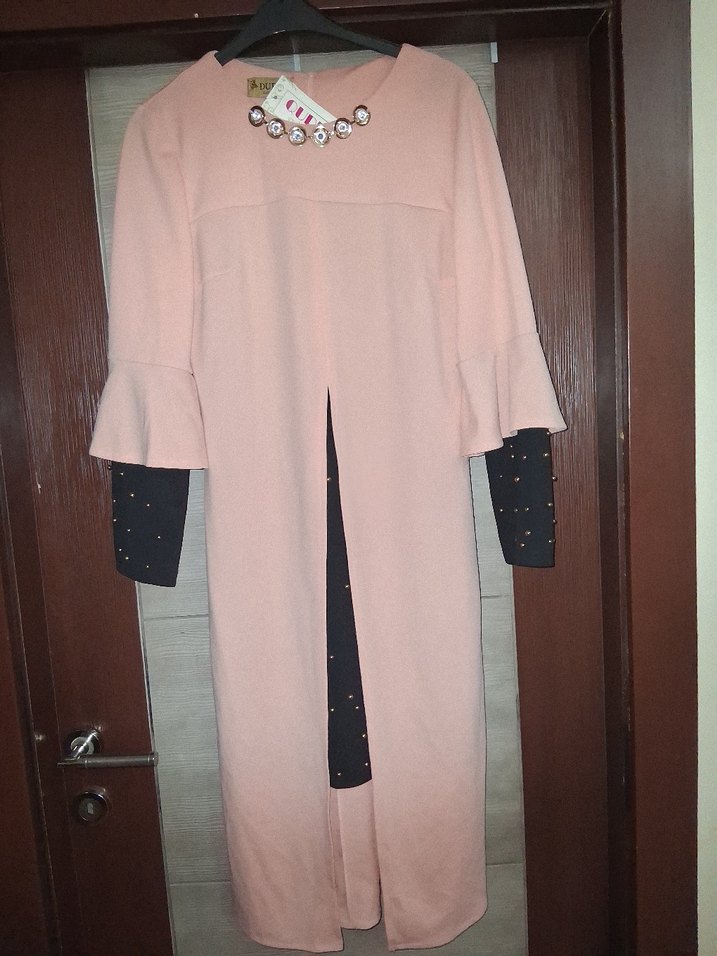 Pastel pembe renkte, uzun kollu ve yuvarlak yakalı bu uzun tunik, drapeli detaylara ve önünde yırtmaçlara sahiptir. Rahat kesimdir ve özel günlerde kullanım için uygundur. ✨