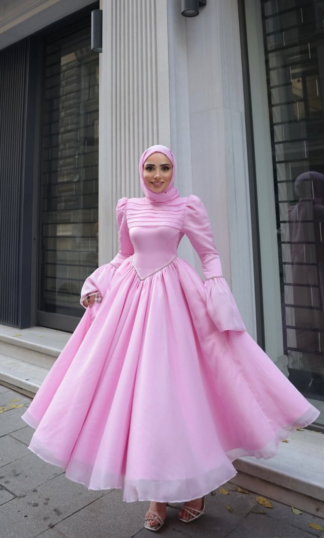38-40-42 beden uyumlu tarih belirtiniz rezerve için Uzun kollu ve drapeli tasarıma sahip pembe uzun abiye, mütevazı ve konvansiyonel kesimle düğünler için uygundur. Straplez yaka kapalı ve pastel ton yumuşaklık katar.