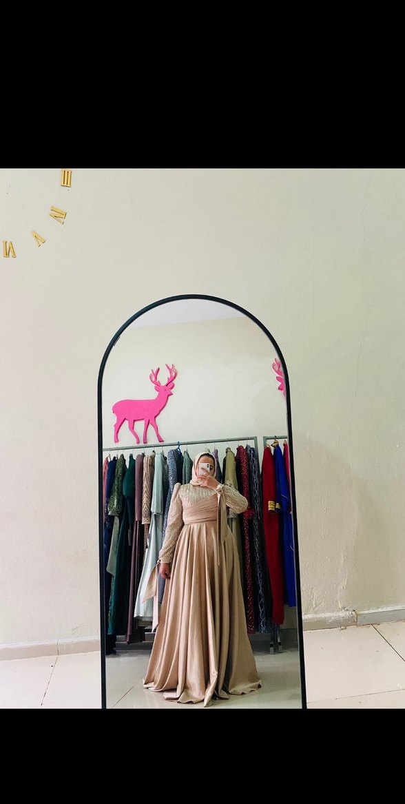 Açık pembe, straplez yakalı, uzun kollu ve etnik desenli uzun elbise. Bol kesim ve drapeli tasarıma sahip, düğünler için uygun.