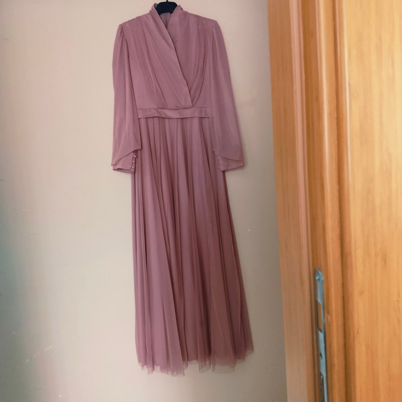 Pembe uzun kollu, V yakalı ve drapeli tasarıma sahip bu abiye elbise, bol kesim ve pastel tonuyla vintage ve modern klasik tarzı bir araya getirir.