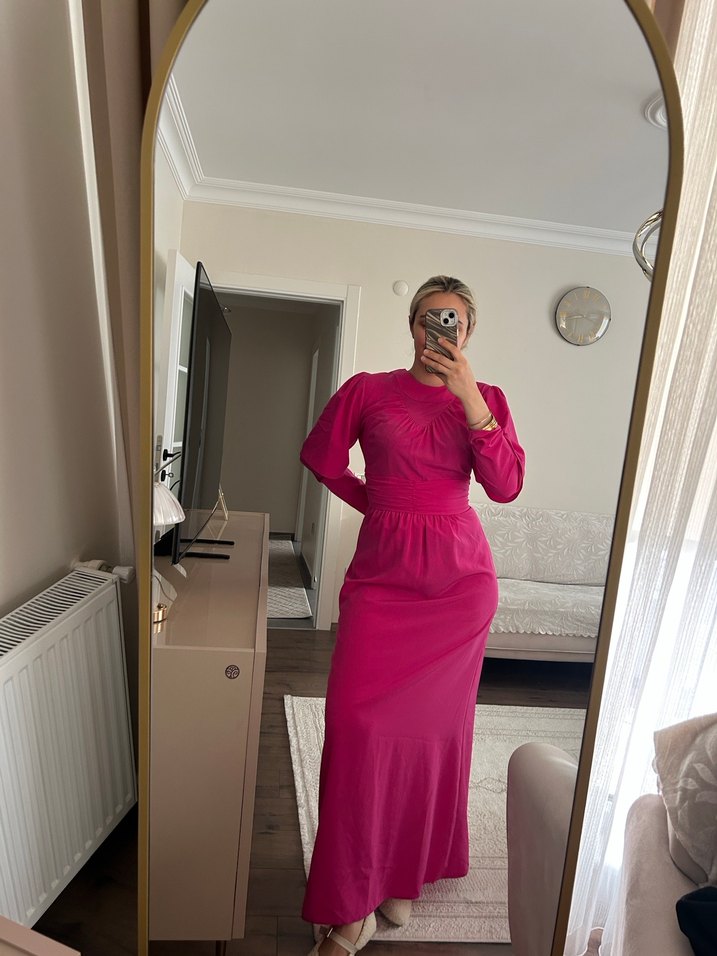 Pembe Uzun Kollu Drapeli Uzun Elbise