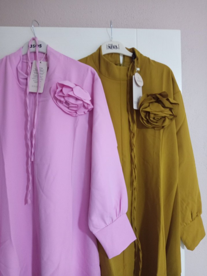 Pastel pembe renkte, uzun kollu ve yüksek yakalı drapeli uzun elbise. İpek gibi yumuşak kumaştan, rahat kesim ve minimalist tarzda günlük kullanıma uygun.