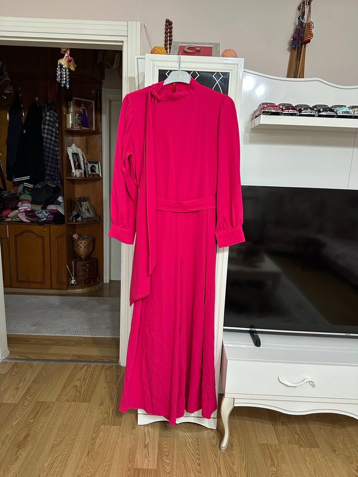 Pembe renkli, uzun kollu, yüksek yakalı, drapeli ve bol kesim uzun tulum. İpeksi kumaştan üretilmiş olup modern klasik tarzdadır. Fotoğrafta gozuktugu gibi düğmesini bir tane taşı düşmüş kolundaki boyu 152 iki koltuk altı 58 belinde kemer 40