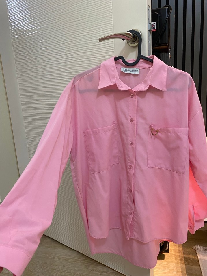 Pastel pembe renkte, düğmeli, yakalı ve uzun kollu, bol kesim gömlek. Ön cepleri ve yumuşak sentetik kumaşı ile rahat bir kullanım sunar.