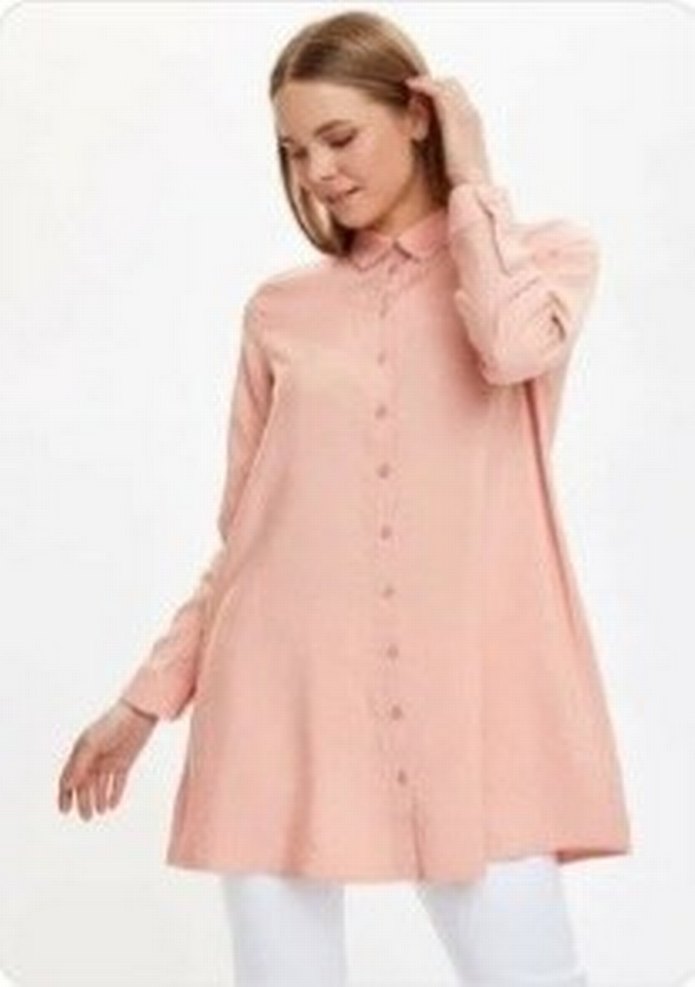 Pembe pastel renkte, uzun kollu, yakalı ve düğmeli rahat kesim midi gömlek tunik. Günlük kullanıma uygundur.
