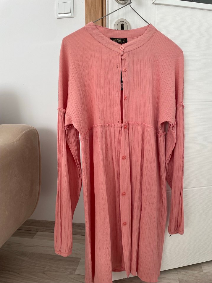 Nefes alabilen keten kumaştan yapılmış, yüksek yakalı, uzun kollu, düğmeli ve bol kesim pembe hamile tuniği. Bohem tarzıyla rahat ve retro bir görünüm sunar.