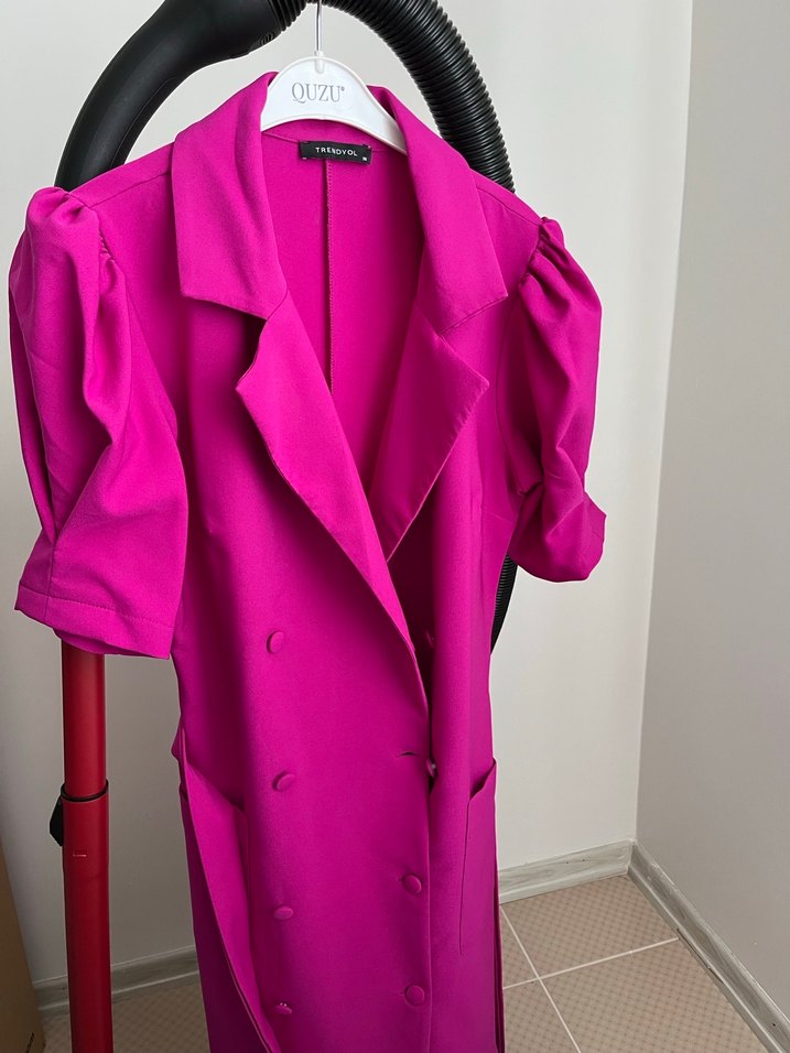 Renkli pembe uzun boy kadın elbise notalı yaka ve düğmeli ön detaylıdır. Askılı kollu, regular fit, iş ve sokak stili karışımıdır. Sentetik kumaştan, ofis kullanımı için uygundur. Desensiz ve Trendyol markalıdır.