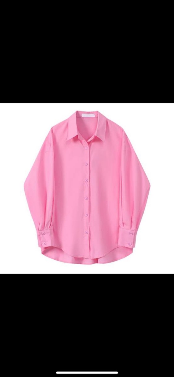 Pastel pembe renkte, uzun kollu ve düğmeli ön kısmı olan kadın gömleği. İpeksi kumaştan, minimal ve sokak stili uyumlu, günlük kullanıma uygun.