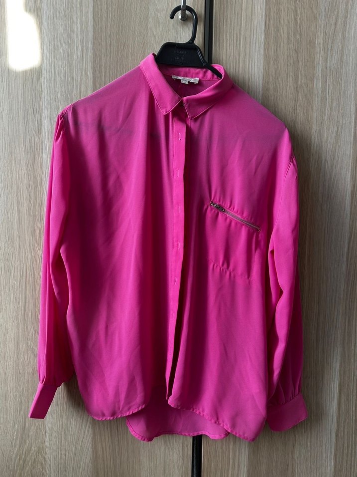 Pembe pastel renkte, düğmeli ve yakalı, bol kesim uzun kollu kadın gömleği. Yumuşak sentetik kumaştan, günlük rahat kullanıma uygun.