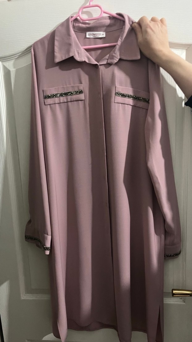 Pembe uzun kollu tunik, yakası çıtçıtlı ve düğmeli, yumuşak sentetik kumaştan minimalist detaylarla günlük kullanıma uygun.