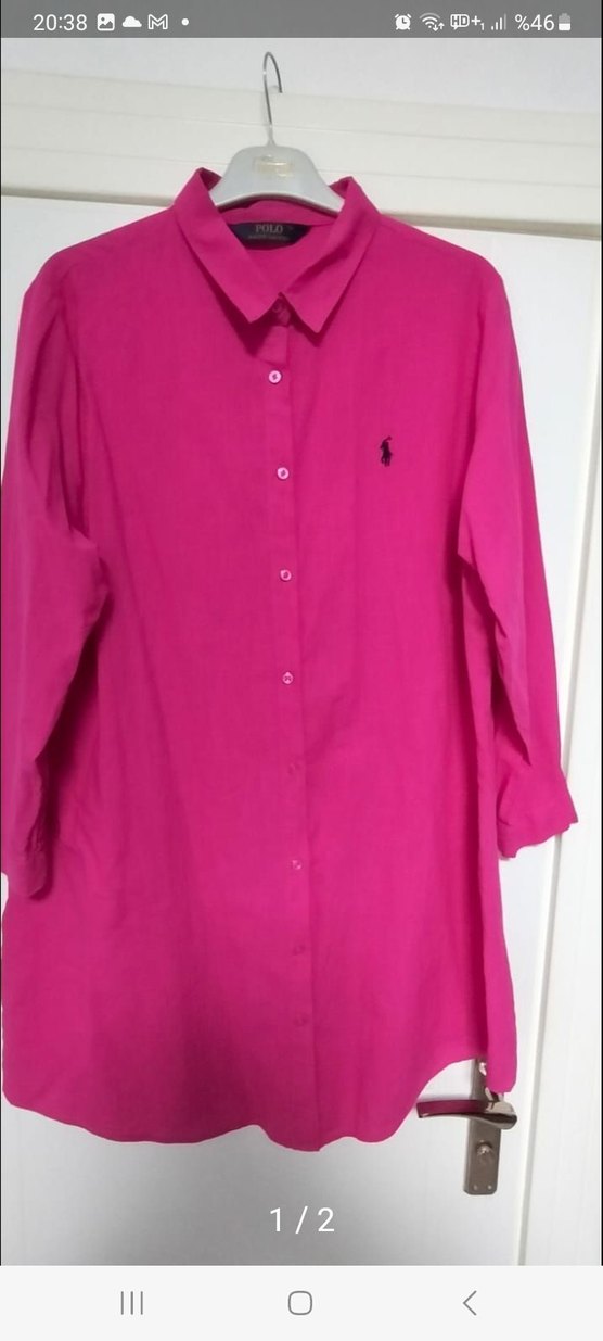 Bol kesim, uzun boy pembe keten gömlek. Düğmeli ve yakalı, günlük sokak stili için uygun.