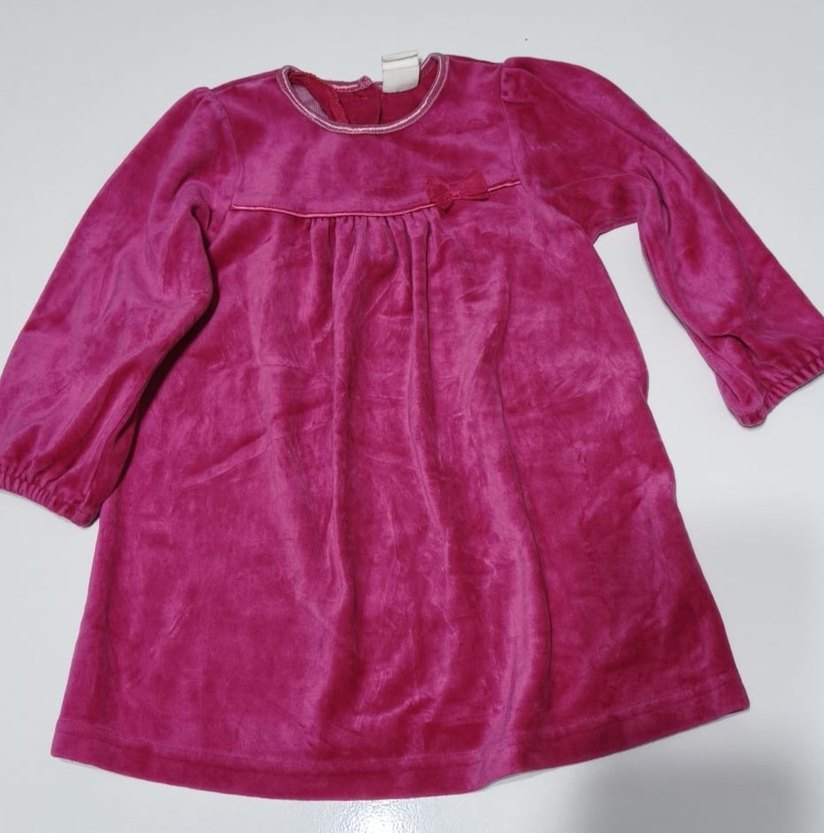 Yumuşak ve sıcak kumaştan, düğmeli, uzun kollu, yuvarlak yakalı, bol kesim pembe kız elbisesi.