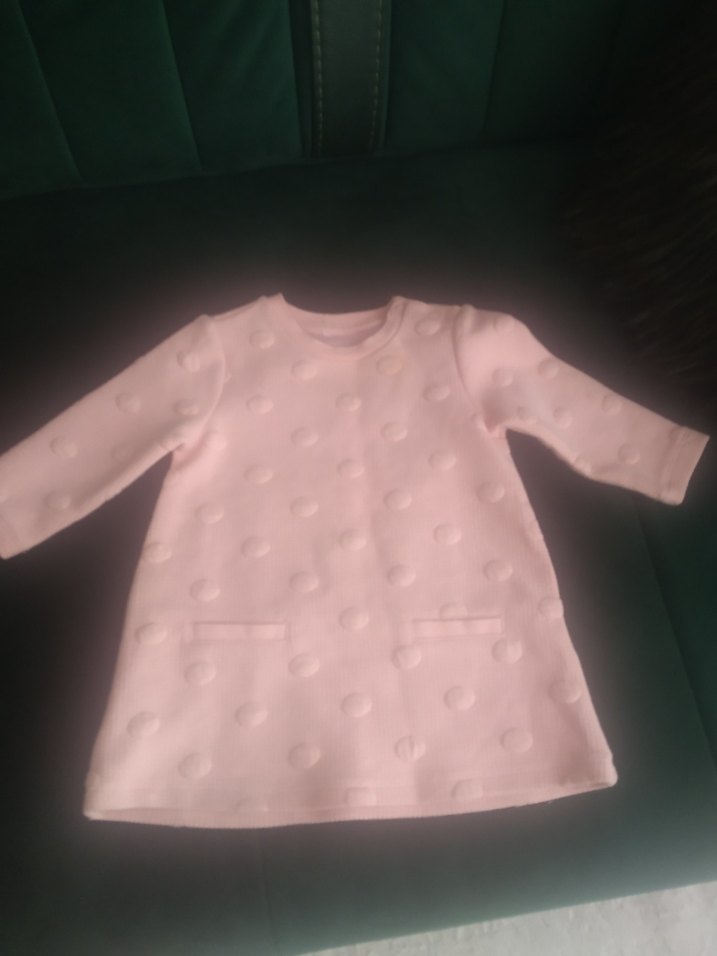 Pastel pembe renkte, uzun kollu, yuvarlak yakalı ve bol kesim elbise. Yumuşak ve sıcak kumaştan üretilmiş, düğmeli detaylı ve hafif dokulu desene sahip. Rahat ve sade tarz için uygun.
