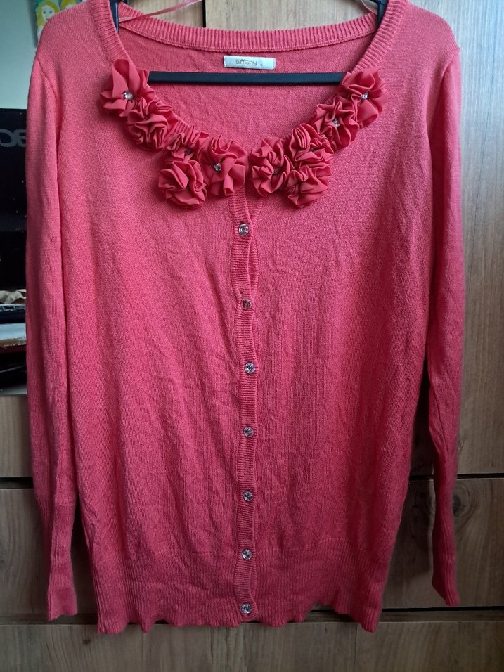 Pembe renk, uzun kollu, düğmeli ve çiçek detaylı triko hırka. Rahat kesimiyle günlük kullanıma uygundur.