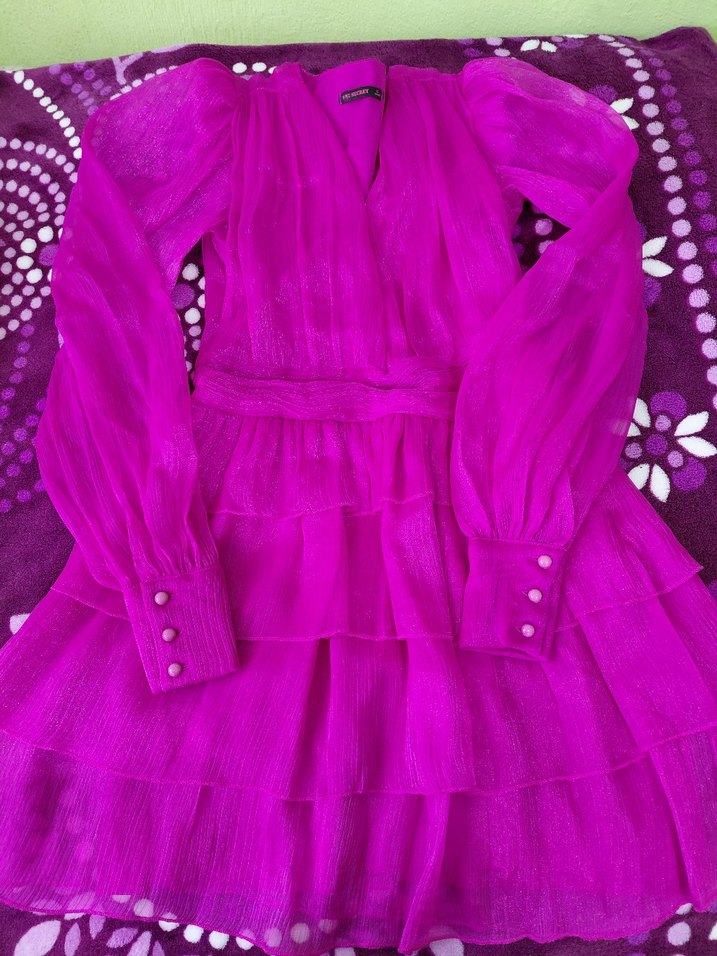 Düğmeli manşetli uzun kollu, kat kat fırfırlı, V yaka, bohem tarzda pembe abiye elbise, şık ve gösterişli parti kıyafeti.