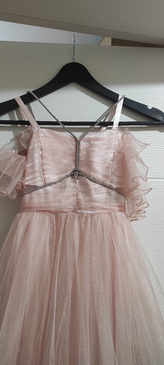 Pastel pembe renkte, fırfırlı askılı kollara ve vücuda oturan kesime sahip uzun abiye elbise. Straplez yaka ve bohem tarzıyla şık bir görünüm sunar.