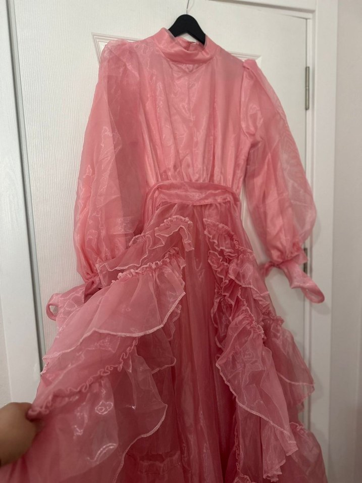 Pembe, yüksek yakalı ve askılı kollu uzun elbise, yumuşak sentetik kumaştan ve fırfır detaylıdır. Vintage düğünler için bol kesim uygundur.