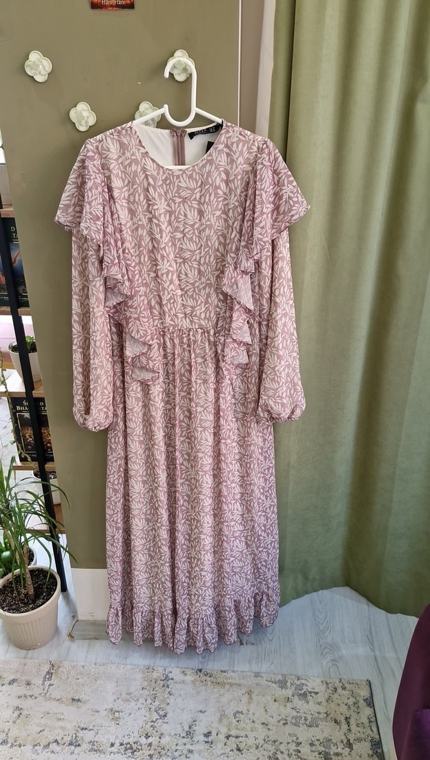 Bu pembe uzun elbise, bol kesim ve fırfır detaylara sahiptir. Sentetik yumuşak kumaştan, uzun kollu ve bohem tarzıyla dikkat çeker.