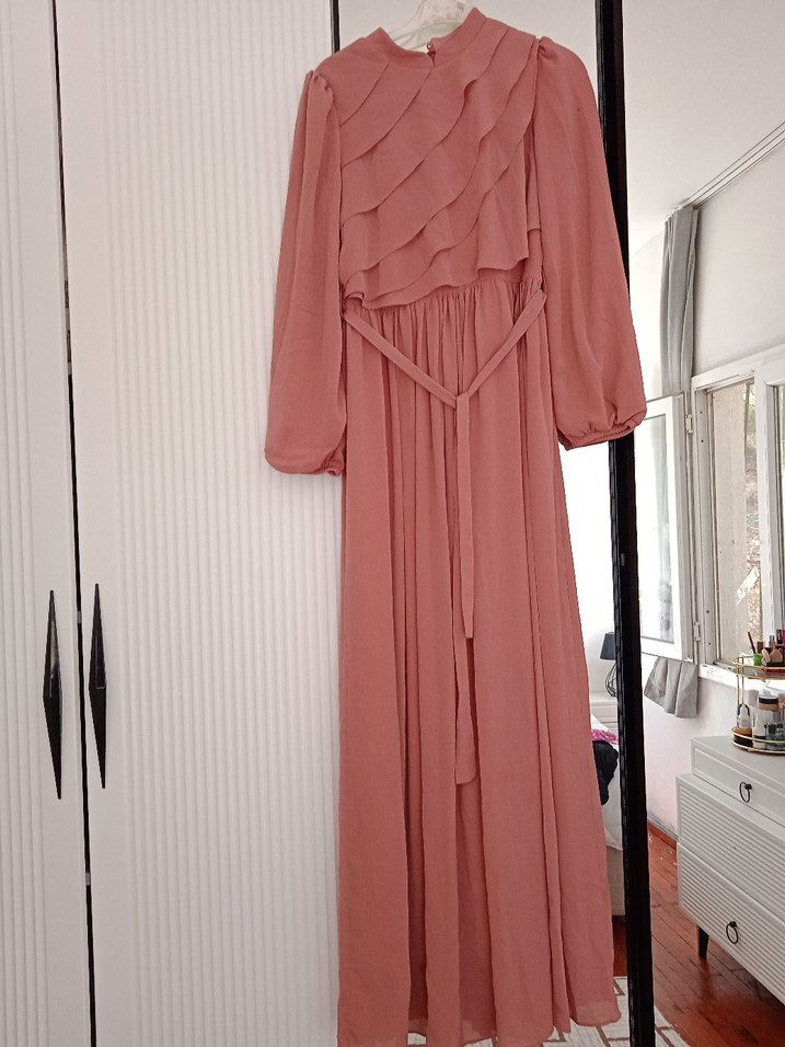 Pembe uzun kollu, yüksek yakalı, fırfırlı detaylı elbise. Bol kesim ve belde kemer ile, yumuşak sentetik kumaştan, düğün için uygun. ürün sayılı kullanıldı iki yerinde küçük bir çamaşır suyu lekesi var etek kısmında fazla belli olmuyor fotoğraftada var çektim küçükte bir yanık yeri var onlarda belli olmuyor bunları göz önünde bulundurarak fiyat koydum ürün yepyeni tertemiz...