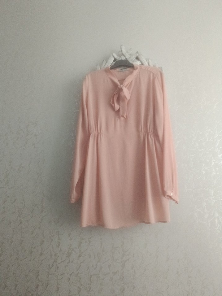Pembe pastel tonlarda, yumuşak keten kumaştan yapılmış, uzun kollu, yüksek yakalı ve fırfır detaylı bol kesim hamile bluzu. Rahat ve minimalist tarzda günlük kullanım için uygundur.