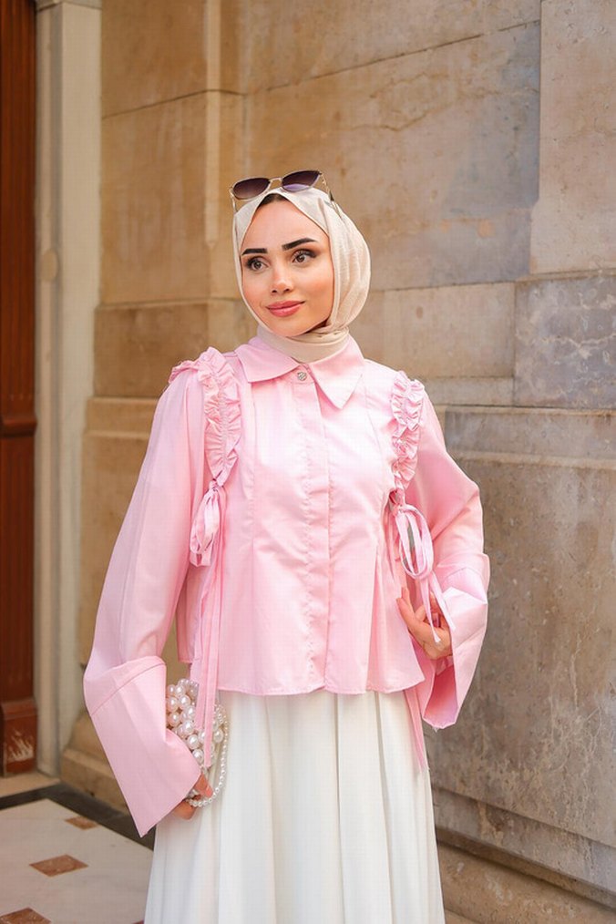 Pembe Uzun Kollu Fırfırlı Kadın Bluz