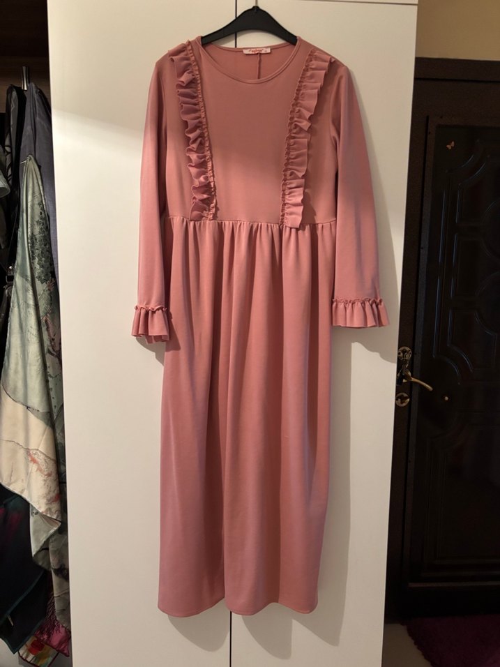 Pembe Uzun Kollu Fırfırlı Kadın Elbise