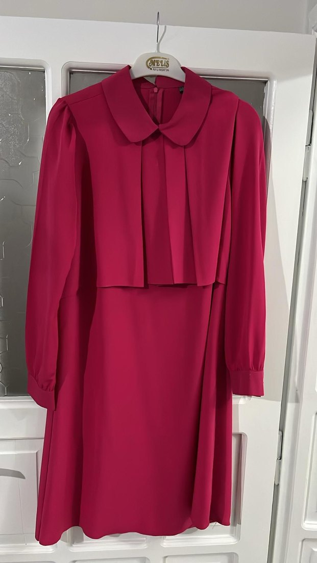 Pembe renkli, yakalı ve fırfır detaylı uzun elbise. İpeksi kumaştan, regular fit ve uzun kollu. Ofis için modern klasik Paris tarzını yansıtıyor.
