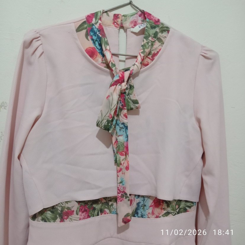 Fitted kesim, uzun kollu, halter yaka ve çiçek desenli fırfırlı detaylara sahip pembe uzun kadın elbisesi. Sentetik kumaştan, vintage ve bohem tarzına uygun.çok ferah dokusu var.
