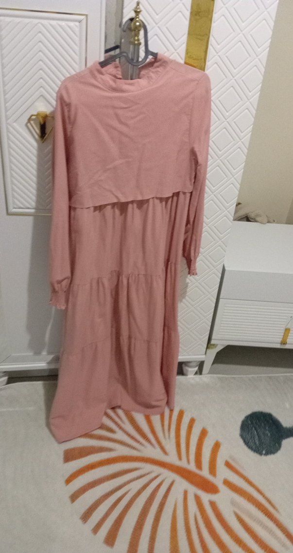 Yumuşak keten kumaştan, yüksek yakalı ve uzun kollu pembe uzun elbise. Rahat kesimi ve fırfır detaylarıyla minimal ve trend günlük tarz için uygun.