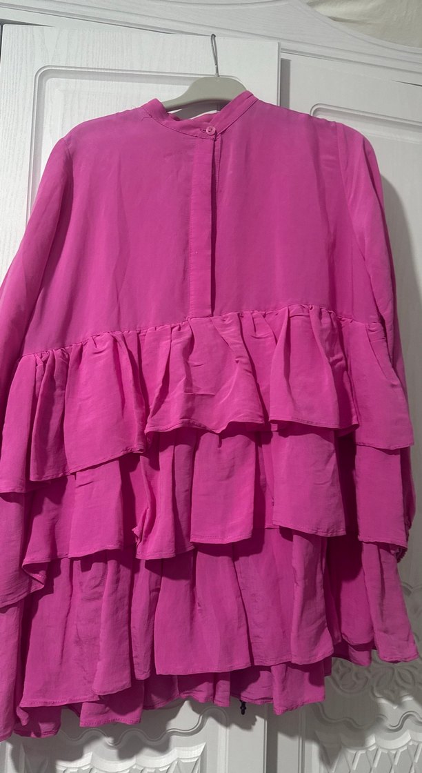 Parlak pembe, uzun kollu, yüksek yakalı ve kat kat fırfır detaylı bol kesim kadın tunik, bohem Paris tarzını yansıtıyor.